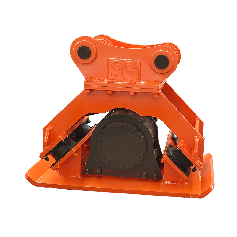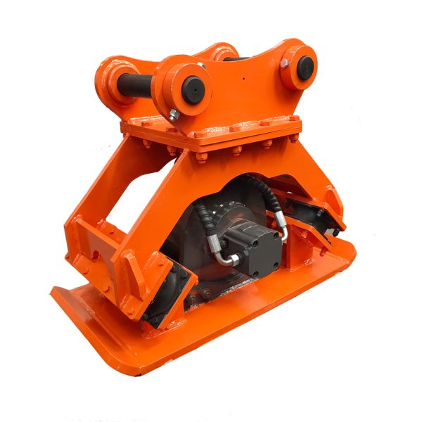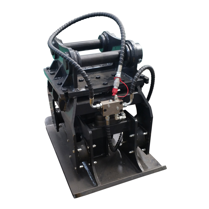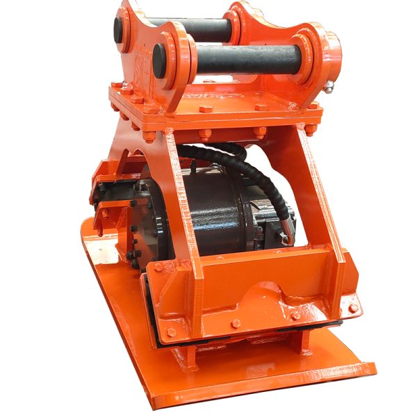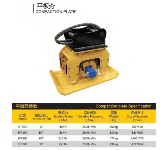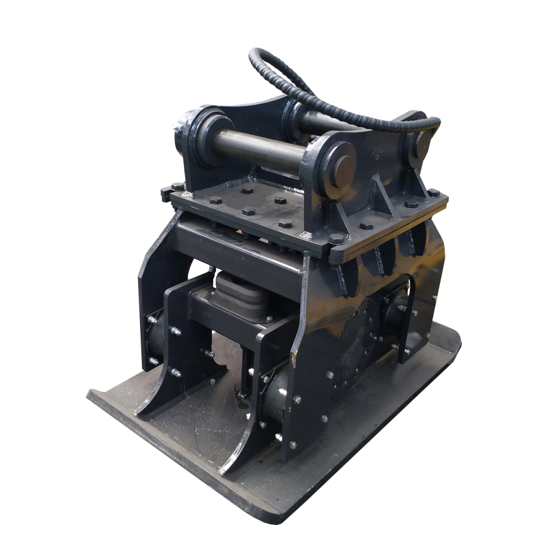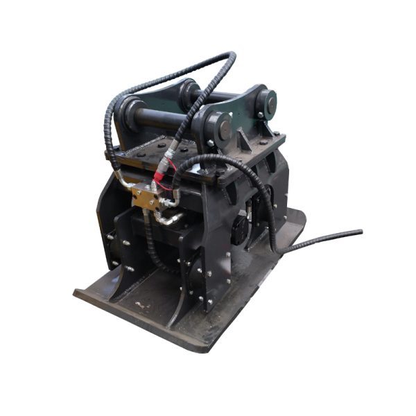 Descripción: Placa de compactación diseñada para excavadoras, con alta potencia de impulso y frecuencia de vibración.